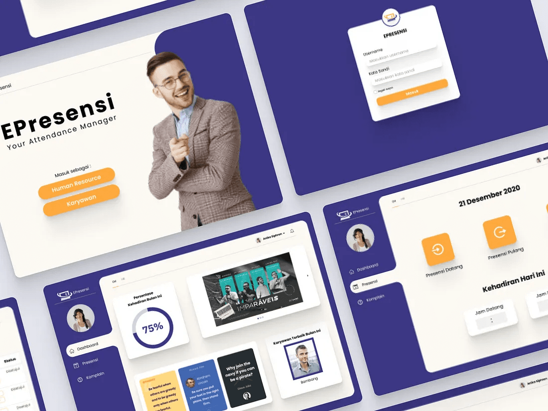 Website E-Presensi, yang dapat memonitoring kehadiran pegawai secara realtime dirancang dengan UI yang menarik dan User friendly. E-Presensi merupakan sistem untuk karyawan melakukan absensi atau bukti kehadiran kantor di masa pandemi yang diakses secara daring. Aplikasi ini berbentuk website dimana karyawan akan lebih mudah dalam melakukan absensi daripada harus mengunduh aplikasi di smartphone. Terdapat tiga aktor disini yaitu user (karyawan), admin dan divisi human resource atau SDM. Project ini dikerjakan bersama tim saya yaitu Grace, Nisa, dan Dhila.