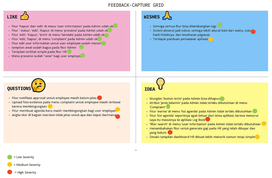 Nah, karena proses Design Thinking ini sifatnya iterasi alias berulang, tentunya ngga berhenti sampai di tes aja dong ya.. Kita lanjut menganalisis data feedback dari partisipan. Kita bagi lagi menjadi 4 kuadran dan menetukan tingkat atau level severity nya seperti ini.
