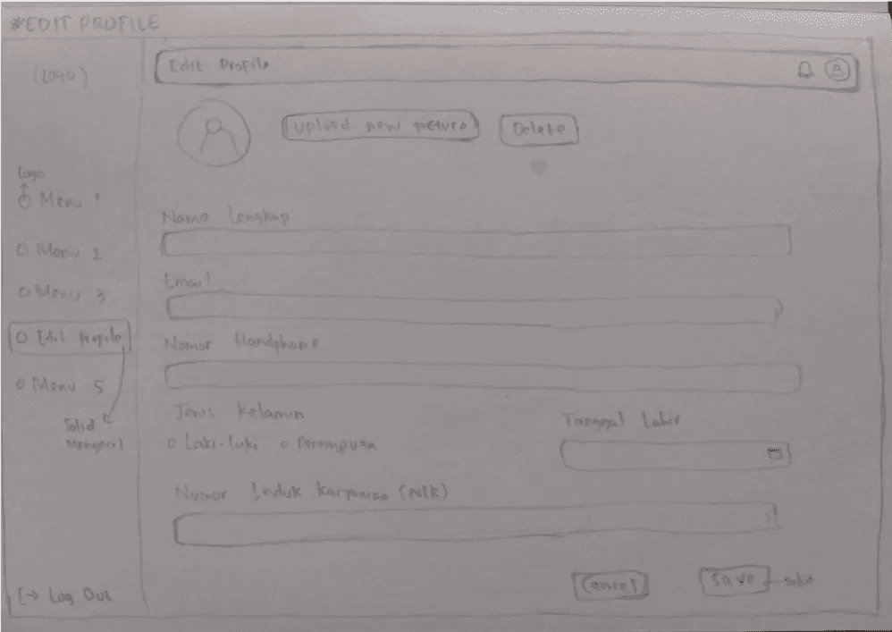 Wireframe Low Fidelity: Desain aplikasi yang sederhana, biasanya berupa coretan di kertas. Wireframe ini digabung sama user flow yang udah dibuat sebelumnya. Tidak terlalu memerhatikan warna terlebih dahulu karena di sini fokus untuk konten, struktur informasi, dan user flow nya saja