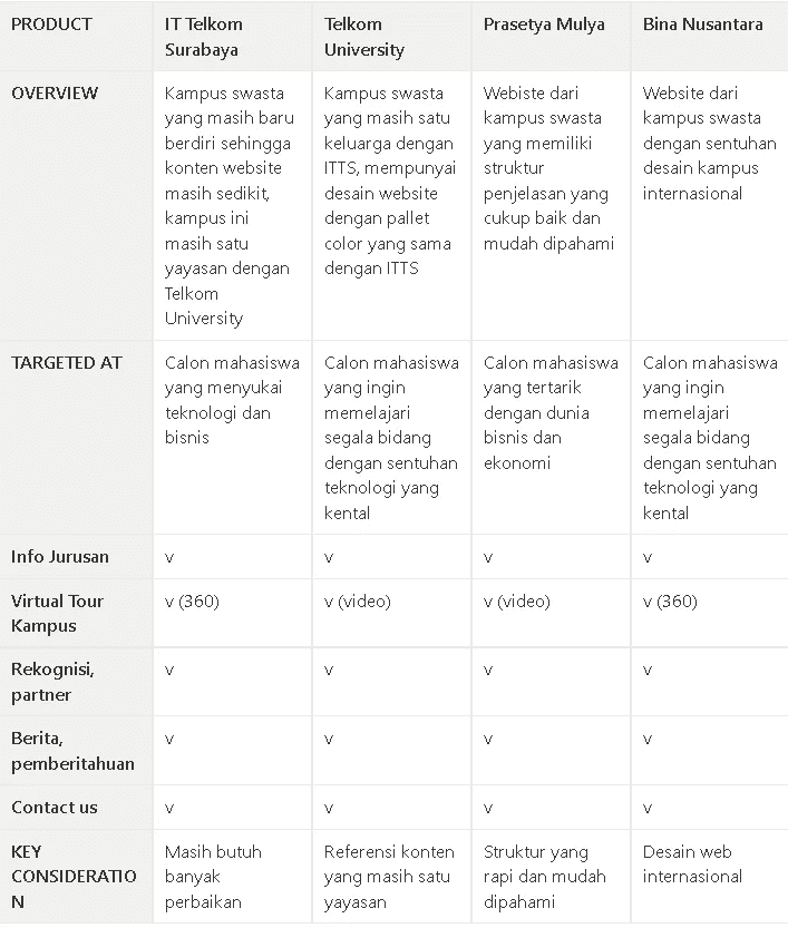 Analisis kompetitor dilakukan untuk mengetahui apakah ada celah diantara pesaing yang masih satu pasar. Dibawah ini adalah sedikit matriks sederhana yang saya buat yang berisi informasi inti seperti target dan fitur dari masing-masing kompetitor.