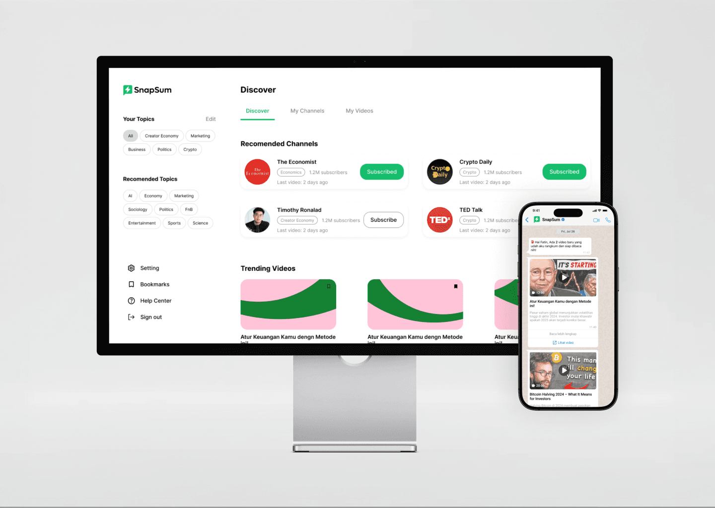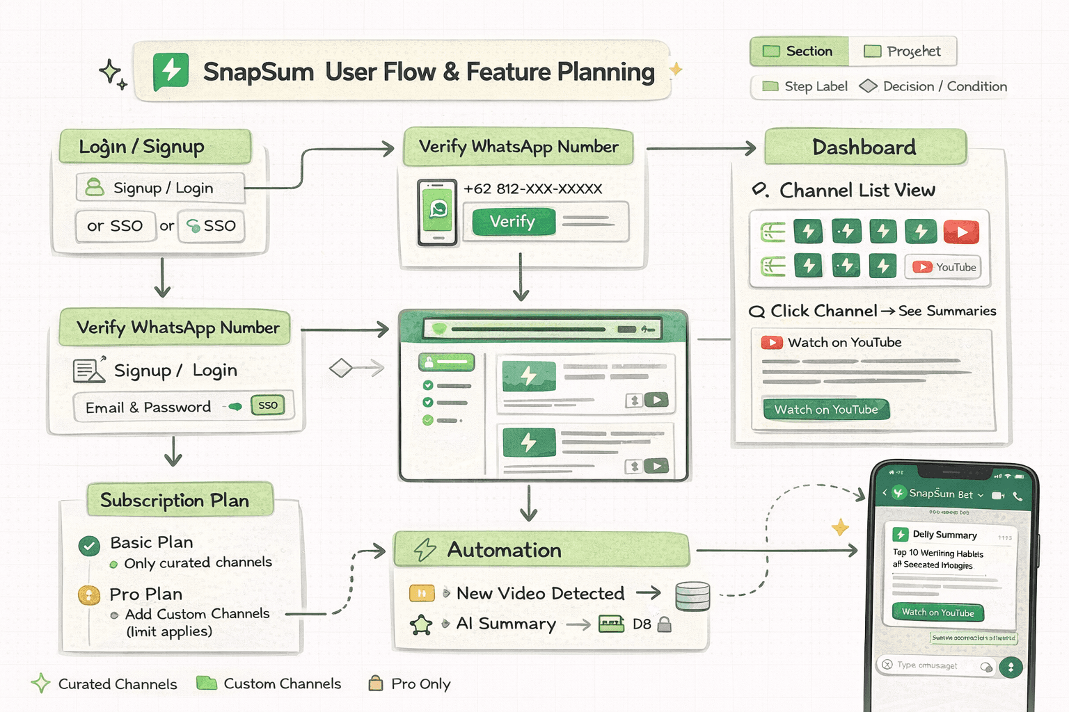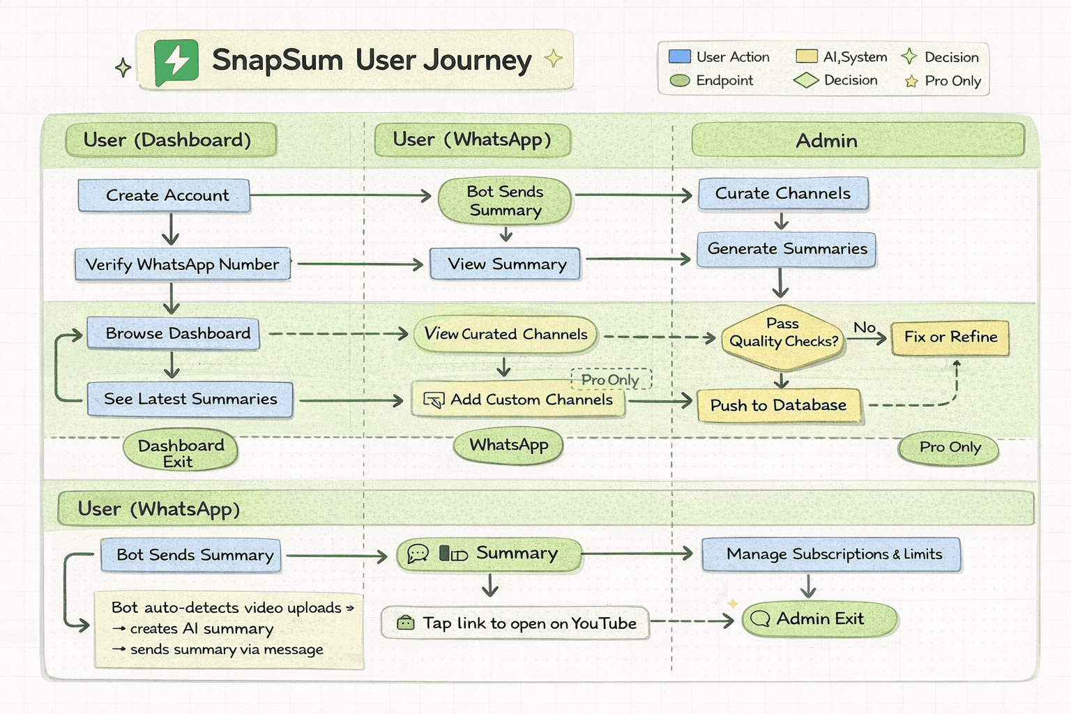 SnapSum is a concept SaaS product designed to help busy professionals stay updated with long form video content without spending hours watching it. The idea focuses on turning newly published YouTube videos into concise, AI generated summaries and delivering them directly via WhatsApp, a platform users already check daily. The project explores how AI, messaging platforms, and content curation can reduce information overload while keeping users informed in near real time.